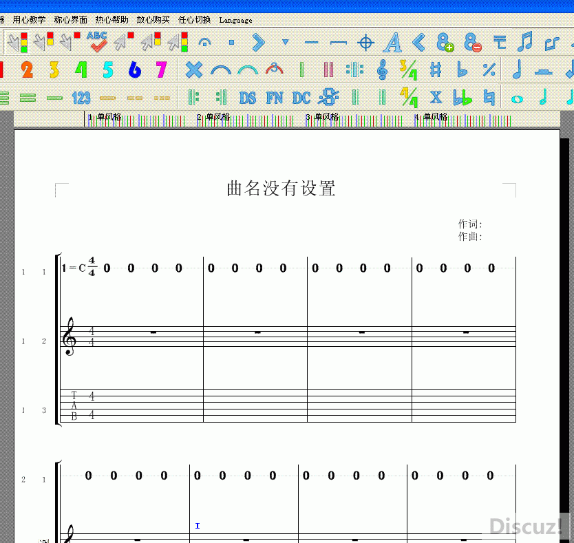 1. 我們首先設置3個聲部的曲譜混排 簡譜 五線譜 吉他譜 如圖: